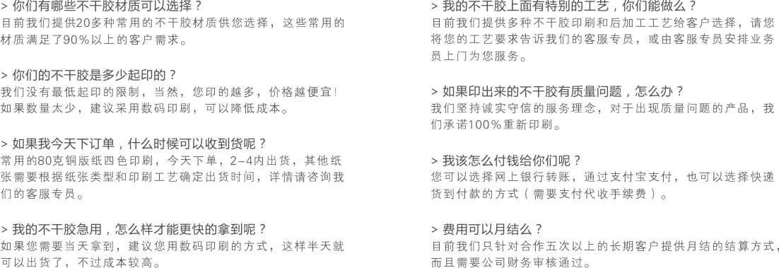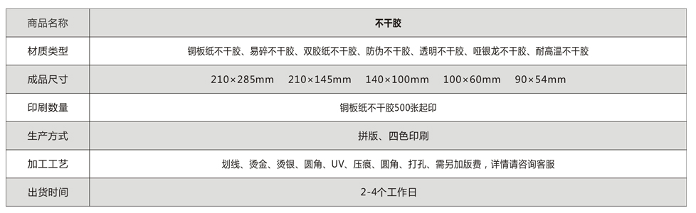 備注補(bǔ)充:1、客戶需提供可印刷電子文件,如需不干膠設(shè)計,不干膠制作每款加費(fèi)用; 2、不干膠后加工可選擇劃線、模切等。