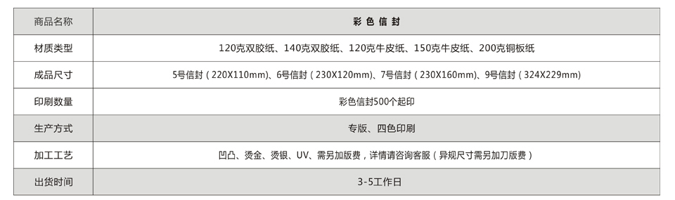 備注補充:客戶需提供可印刷電子文件,如需設計,每款加收設計費元;彩色信封印刷制作工藝可選擇燙金、燙銀、擊凸、UV等。